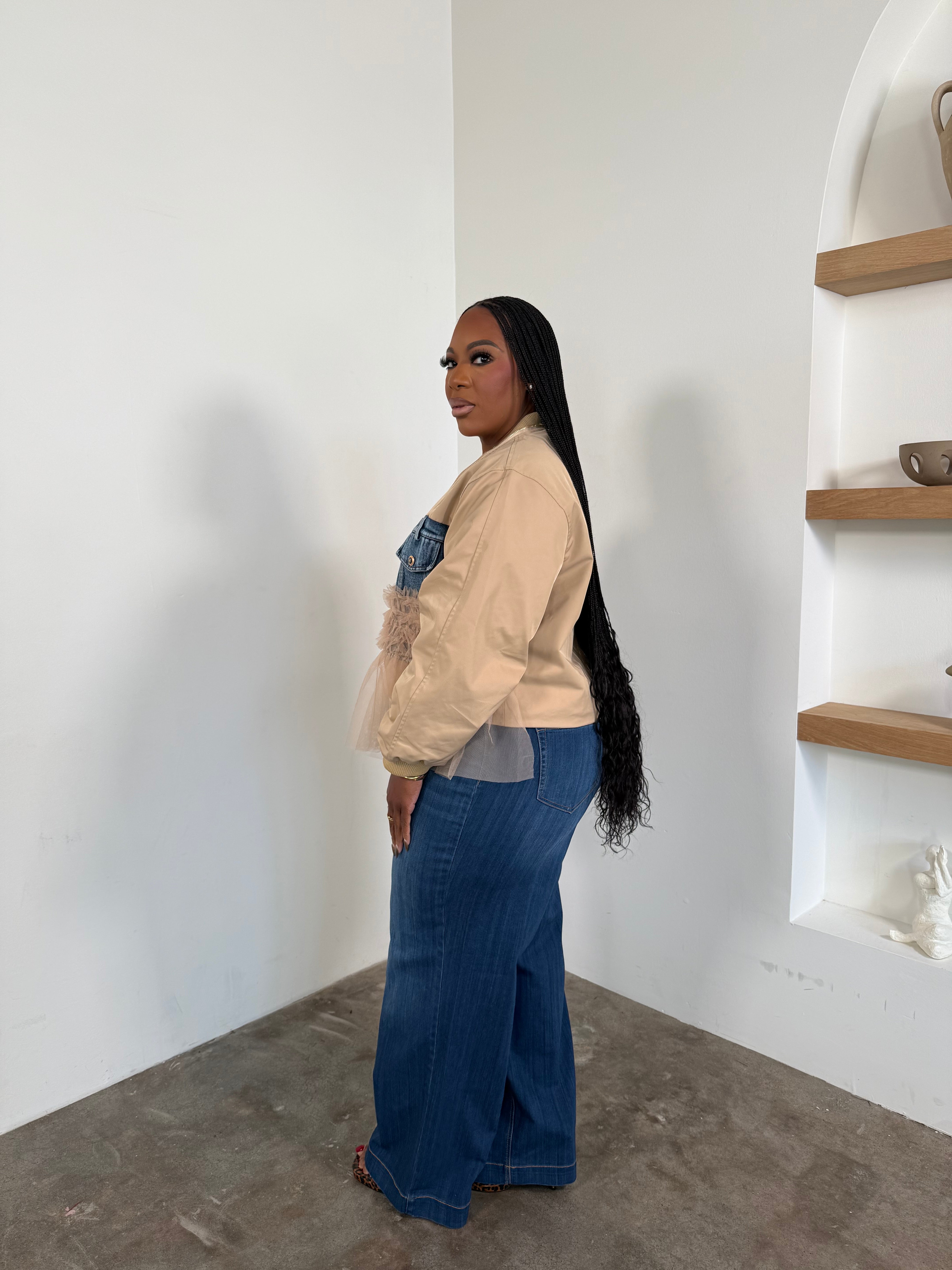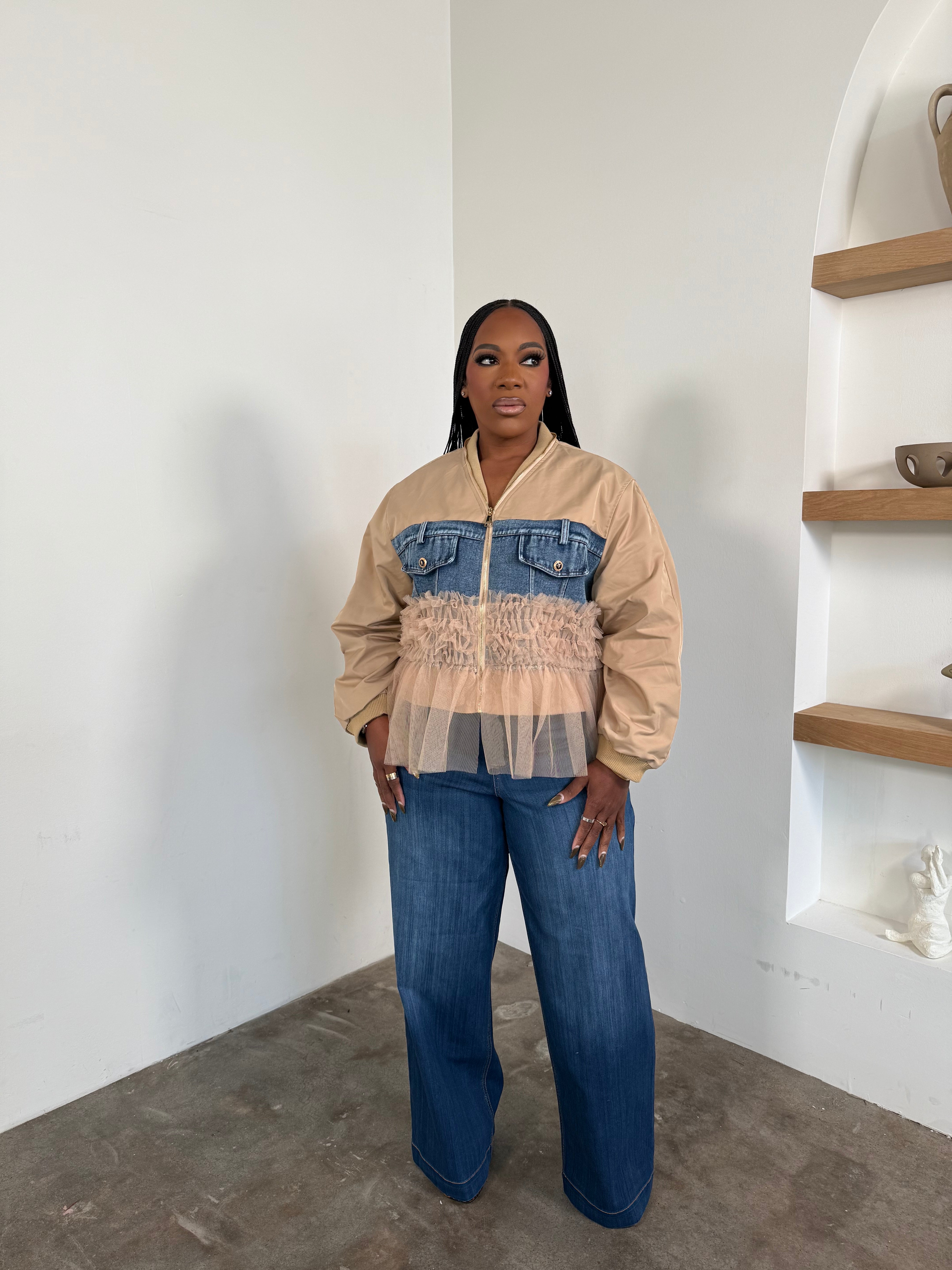 Tulle Trim Denim Jacket (Beige) 4142