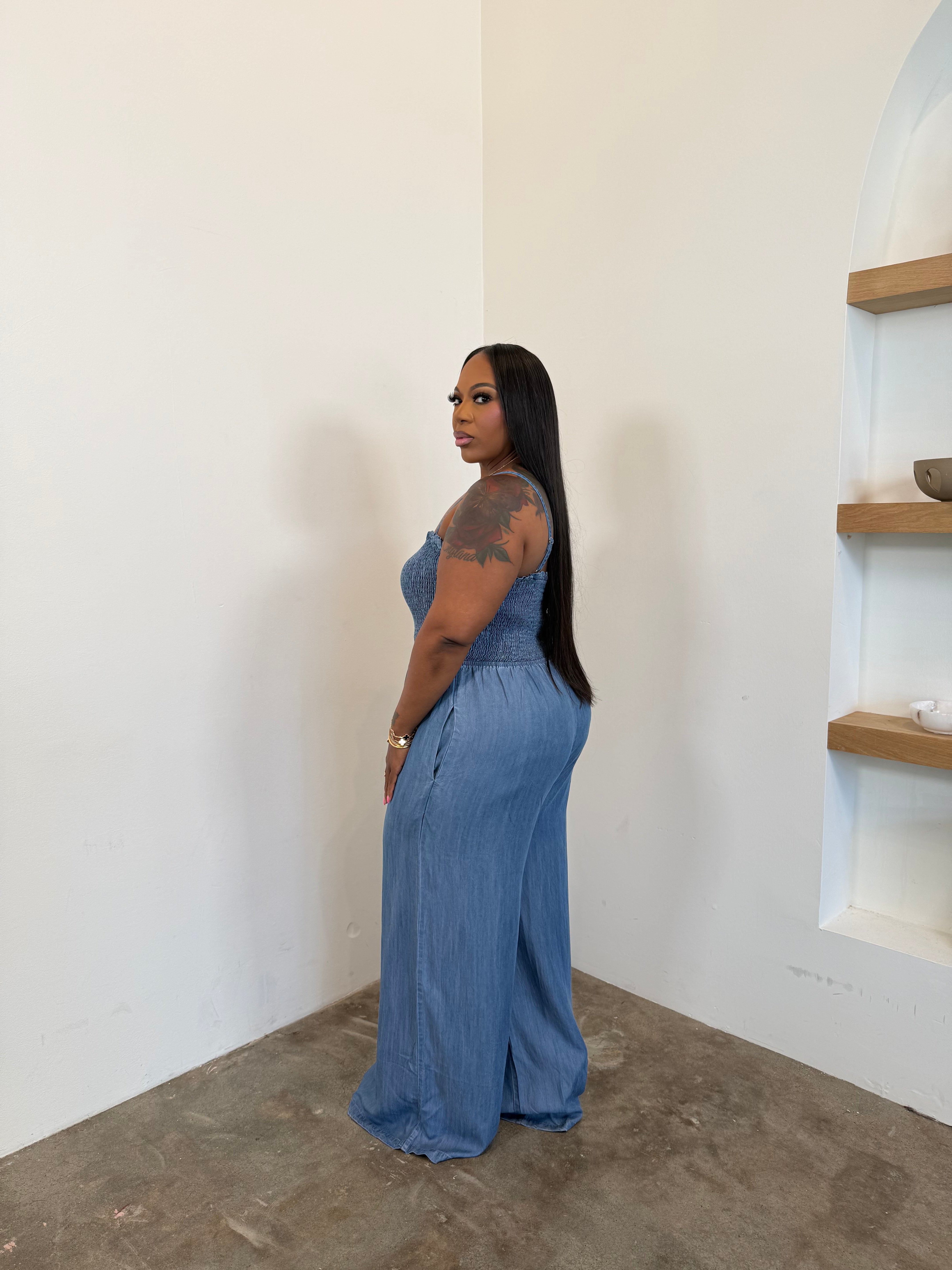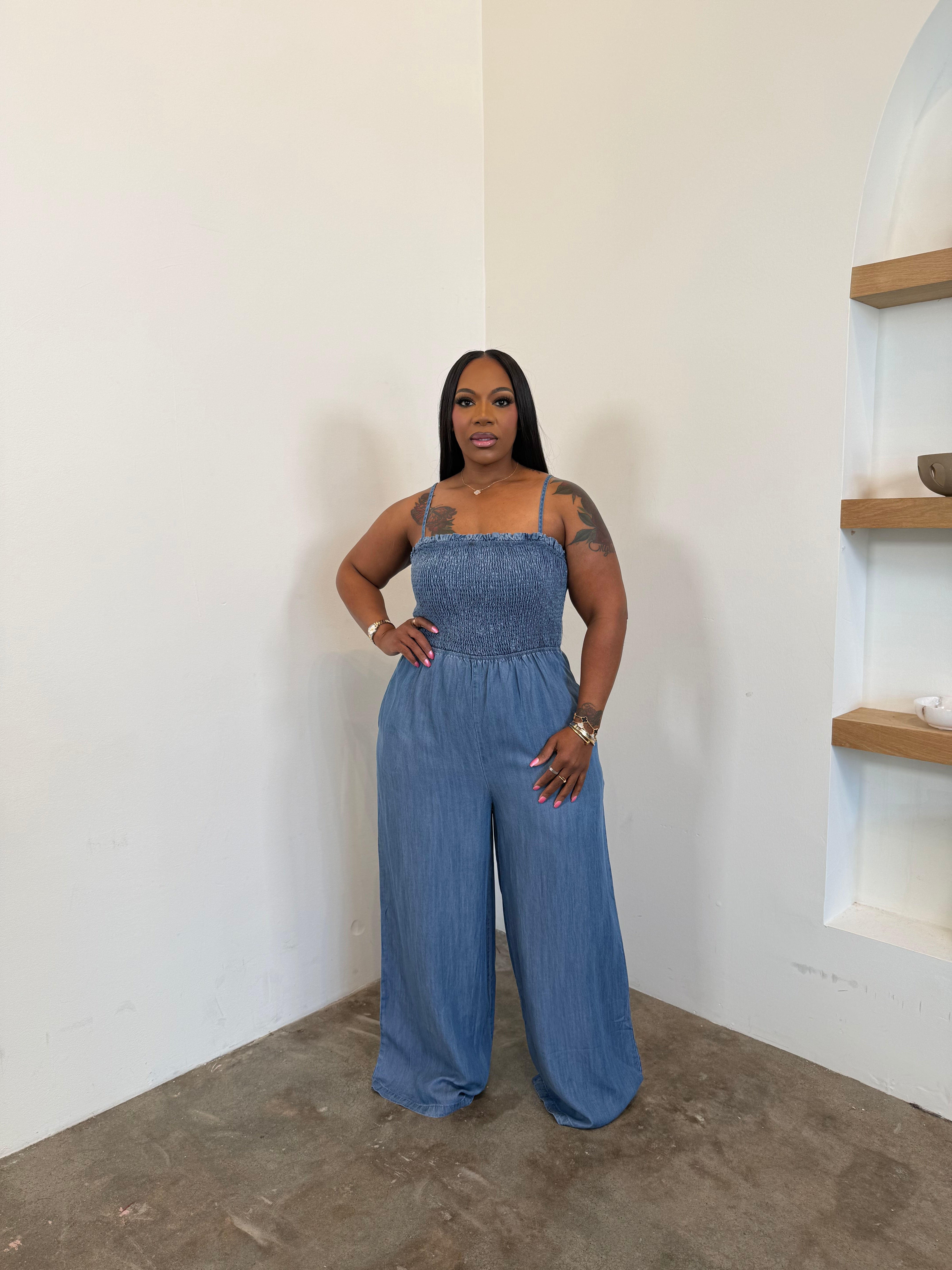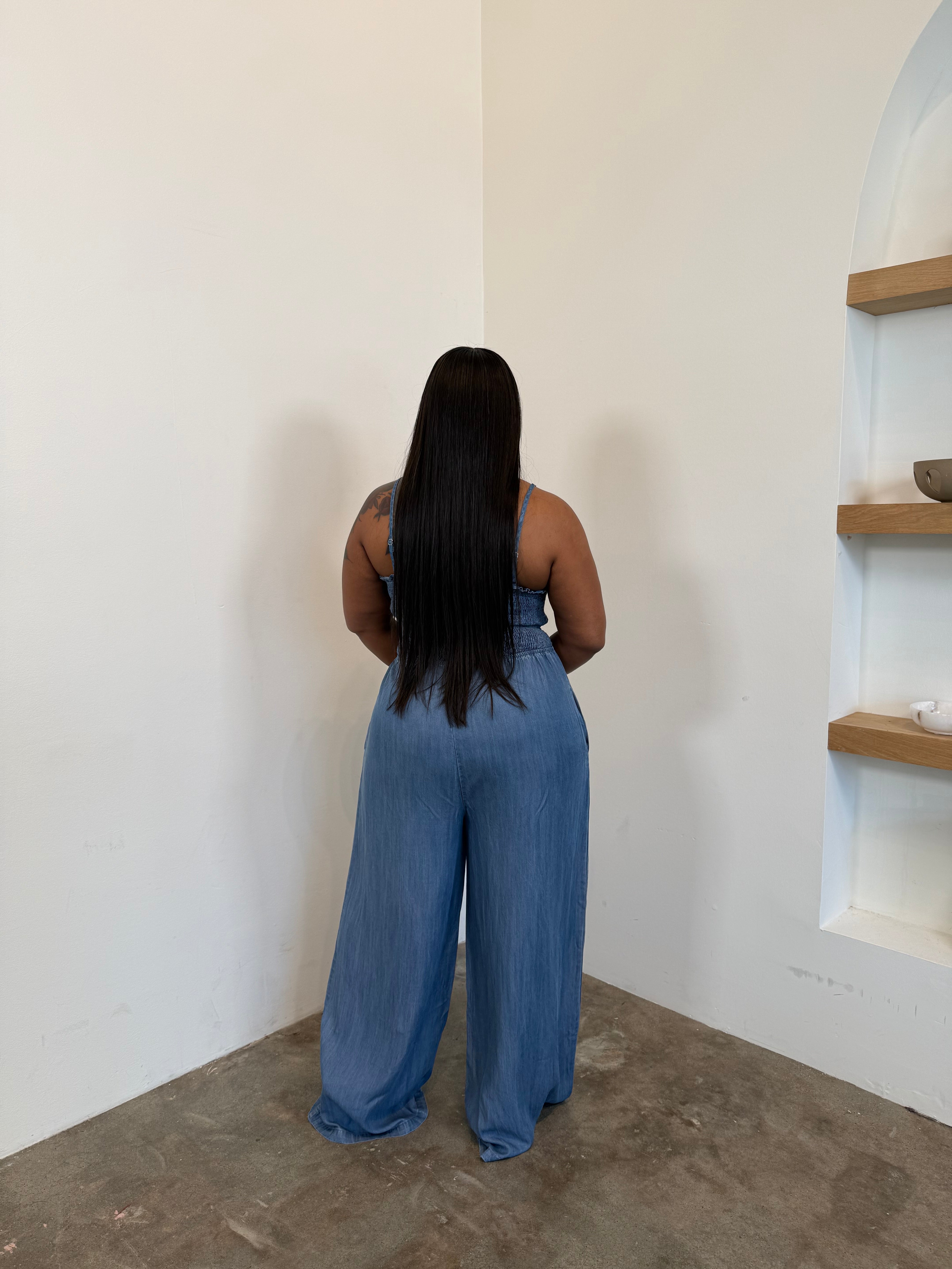Smocked Denim Jumpsuit
